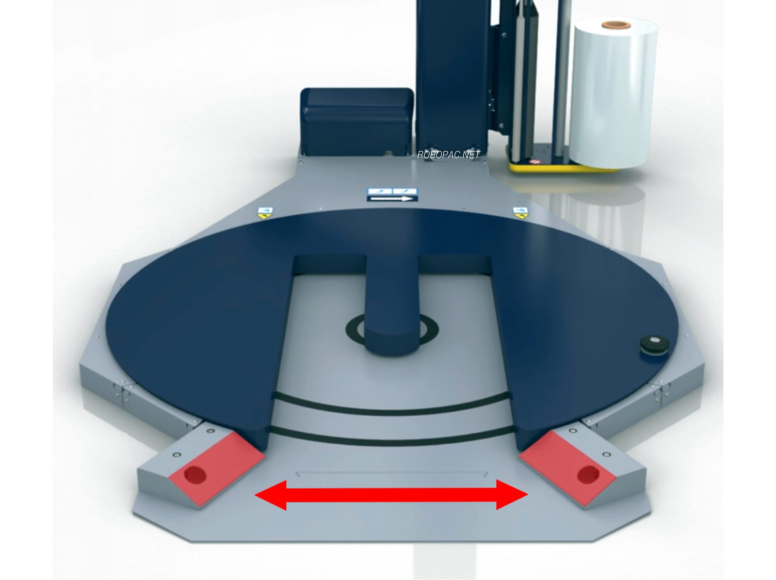 膜架在尾轮轴上带有机械制动:不论卷筒直径如何,可连续拉伸包装膜。 制动的快速连接/断开设备有助于让膜和托盘底部衔接。 可手动调节的制动能够作用于橡胶滚轮,从而调节缠绕膜张力。 补充的金属滚轴位置能够确保制动滚轮附近的膜能够"抱紧"。